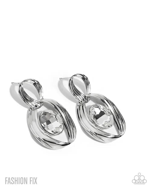 Featuring a subtle layered finish, varying sizes of glistening interconnected silver rings, with the lowermost larger ring showcasing a highly faceted white oval gem, sways from the ear for a spellbinding shimmery lure. Earring attaches to a standard post fitting.