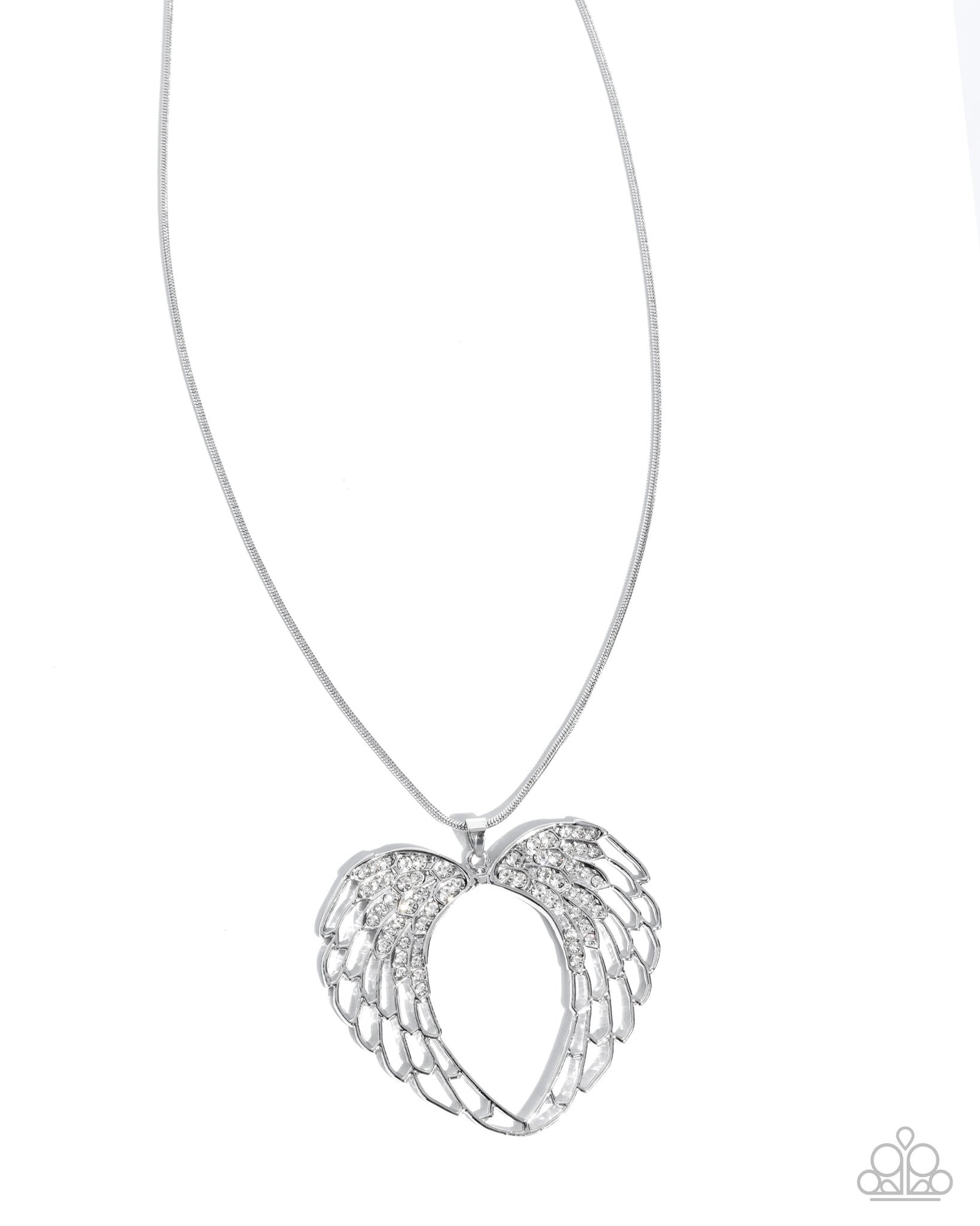 A sleek silver snake chain showcases a dazzling heart-shaped pendant formed by two intricately detailed angel wings. The wings are encrusted with glittering white rhinestones, adding a celestial sparkle to the design. Features an adjustable clasp closure.