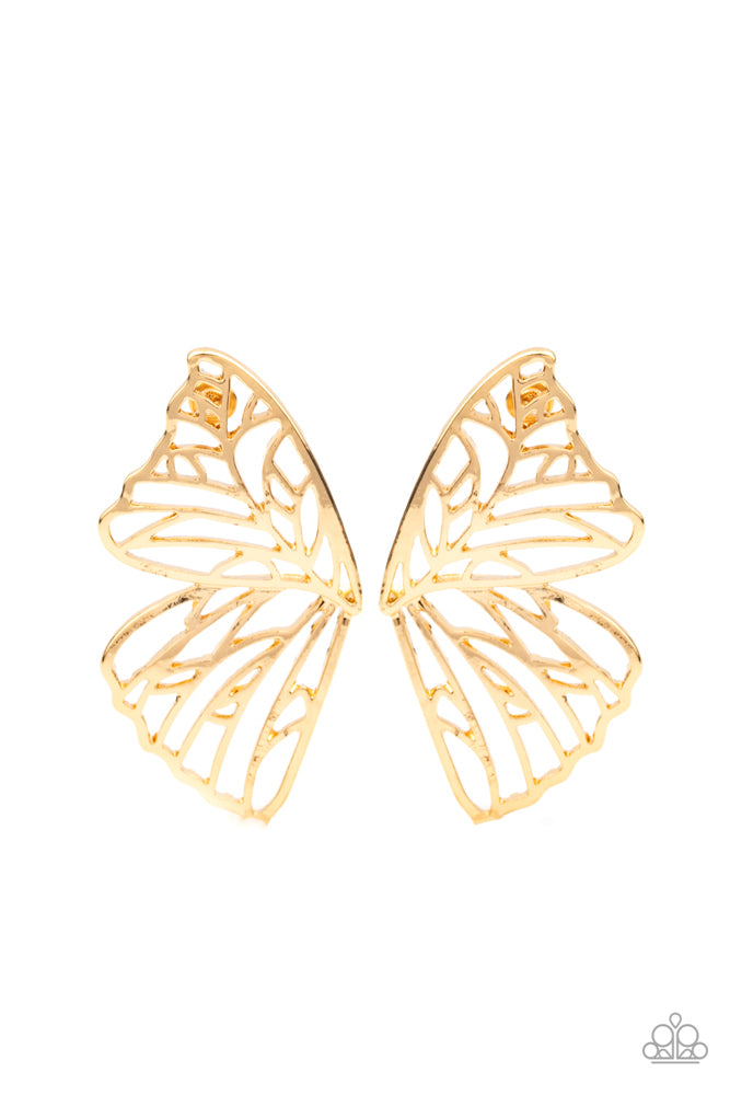 Shimmery gold bars delicately climb scalloped gold frames, coalescing into a whimsical butterfly wing. Earring attaches to a standard post fitting. Sold as one pair of double-sided post earrings.
