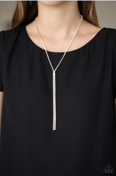 Featuring square gold fittings, a dainty strand of glassy white rhinestones drapes around the neck. The glittery strands delicately connect, splitting off into two twinkling tassels down the chest. Features an adjustable clasp closure.
