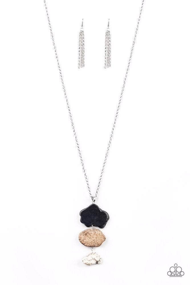 As if chipped off a cliff, pieces of black, brown, and white rock link at the bottom of a lengthened silver chain for an earthy look. As the stone elements in this piece are natural, some color variation is normal. Features an adjustable clasp closure. Sold as one individual necklace. Includes one pair of matching earrings.