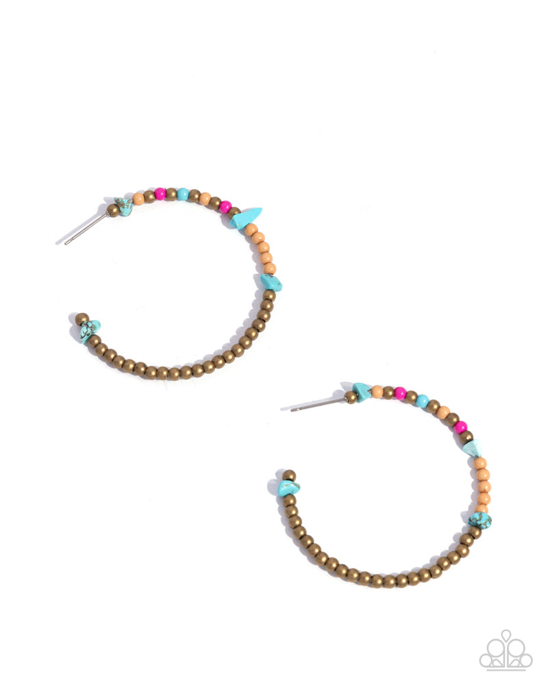 The top half of a hoop is lined in an alternating pattern of turquoise stone, brass beads, and light peach, pink, and tiffany seed beads, while the bottom half features glistening brass beads with a solitaire turquoise stone creating a boldly balanced look. Earring attaches to a standard post fitting. Hoop measures approximately 1 3/4” in diameter. As the stone elements in this piece are natural, some color variation is normal. Sold as one pair of hoop earrings.
