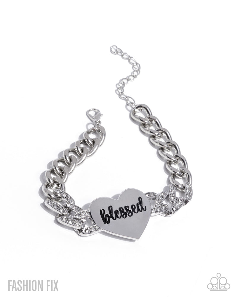 Dusted in dainty white rhinestones, a thick collection of silver curb chain links encircles the wrist, proudly showcasing a glistening silver heart at its center where the word "blessed" in a cursive-inspired font goes across its front, creating a blissfully bold display. Features an adjustable clasp closure. Sold as one individual bracelet.
