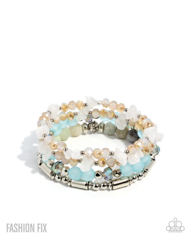 Featuring a collection of eclectic materials, chiseled amethyst, light blue, and light pink stones, silver beads and accents, crackled stones, and faceted beads in various shades patterns along elastic stretchy bands for a flourishing, fashionable stack up the wrist. As the stone elements in this piece are natural, some color variation is normal. Sold as one set of four bracelets