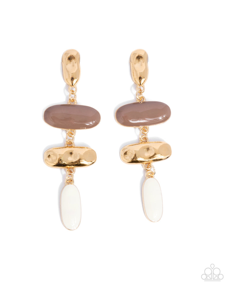 Featuring a hammered texture, a vertical gold post gives way to a horizontal Raw Umber and additional gold-hammered fitting, finishing off with an ivory-painted vertical fitting for a jaw-dropping lure. Earring attaches to a standard post fitting. Sold as one pair of post earrings.