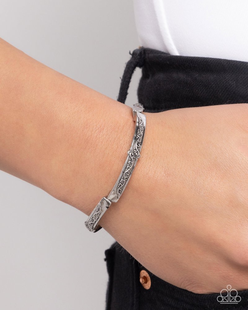 Embossed in rustic vine-like filigree, dainty silver frames gently curve as they are threaded along stretchy bands around the wrist for a seasonal fashion. Sold as one individual bracelet.